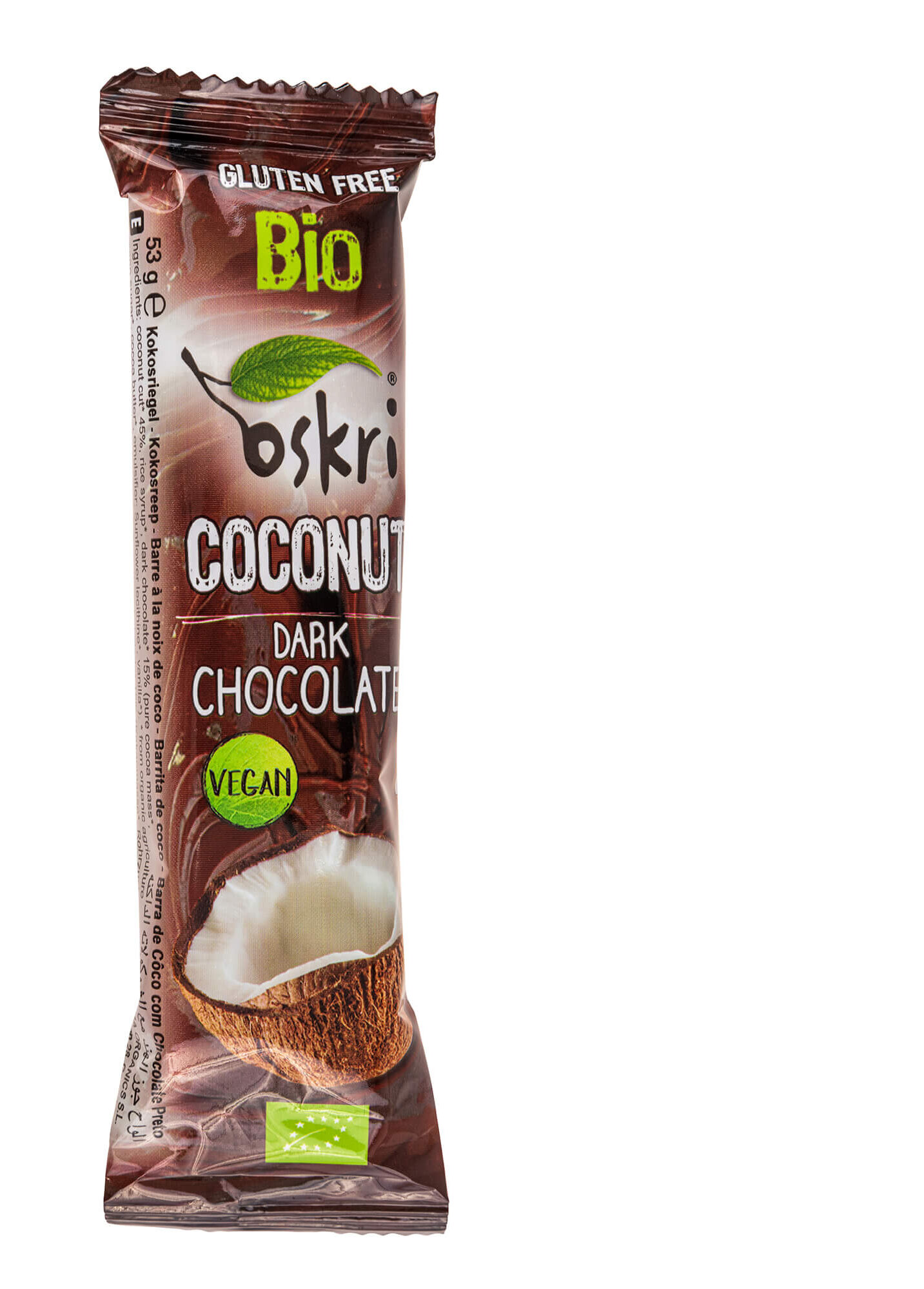 Zutaten: Kokosraspeln* 45%, Glukosesirup aus Reis*, Zartbitterschokolade* 15% (Kakaomasse*, Zucker*, Kakaobutter*, Emulgator: Lecithine aus Sonnenblumenkernen*, Vanille*)